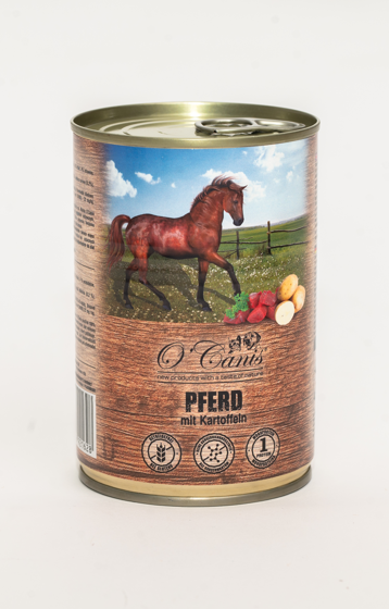 O'Canis konina z ziemniakami to kompletna karma mokra najwyższej jakości naturalnych składników, bez sztucznych aromatów, obcych protein, konserwantów i substancji barwiących. Dzięki delikatnej obróbce jest wyjątkowo niedrażniąca, gwarantuje wysoki poziom tolerancji i łatwość trawienia. Wysoki poziom dostępności biologicznej zapewnia niskie zużycie karmy. Karma jest produktem w sosie własnym ze świeżym mięsem i idealnie nadaje się dla psów w każdym wieku.