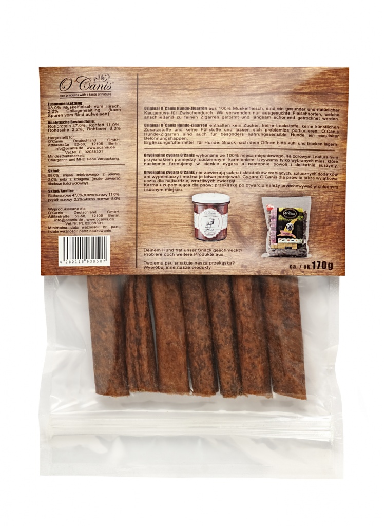 Oryginalne cygara O'Canis wykonane ze 100% mięsa mięśniowego, są zdrowym i naturalnym przysmakiem pomiędzy codziennym karmieniem, Używamy tylko wybranych mięs, które następnie formujemy w ciemnie cygara a następnie powoli i delikatnie suszymy.